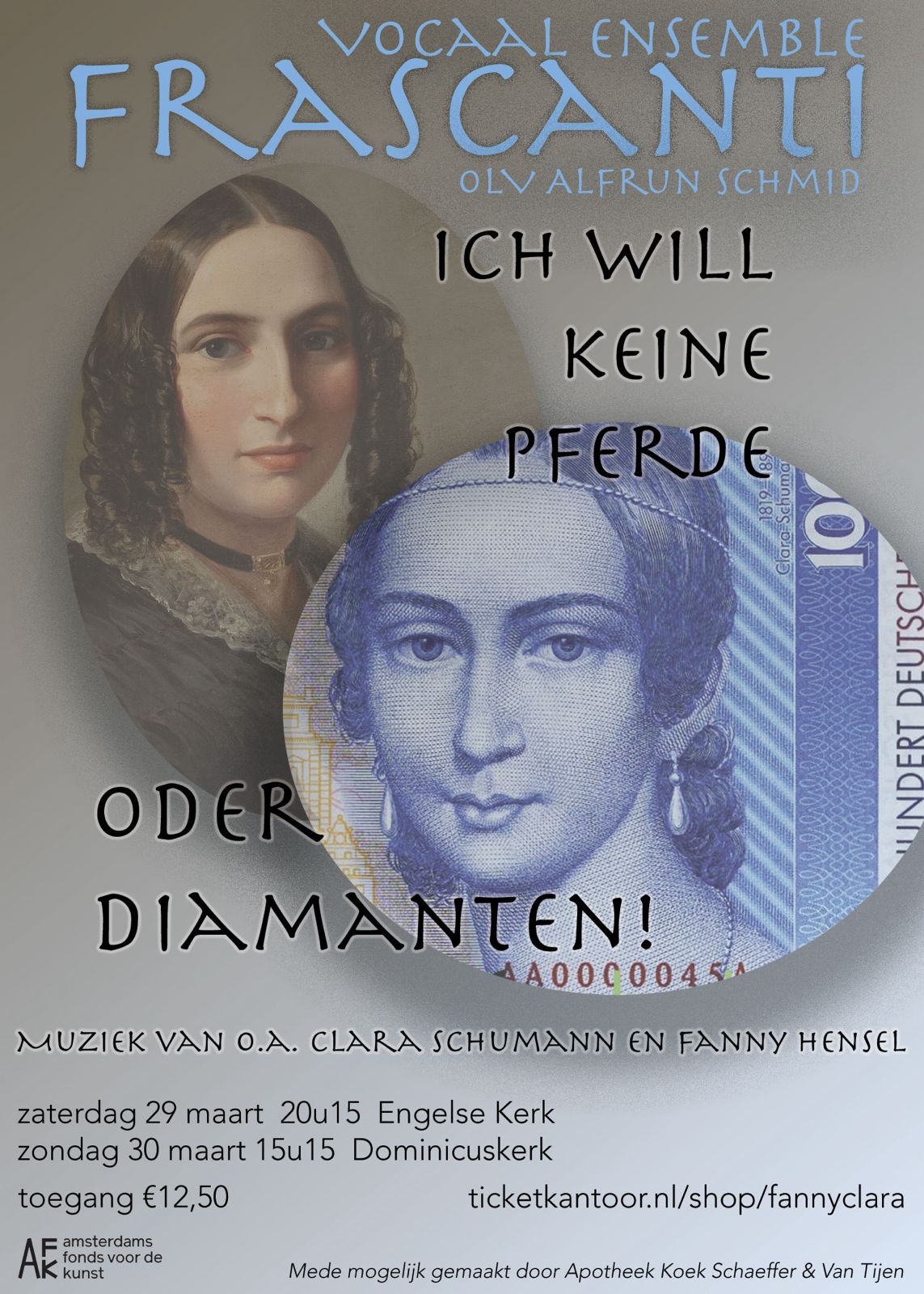 We zingen stukken van Fanny Hensel (Felix Mendelssohn Bartholdy was haar broer) en Clara Schumann (getrouwd met Robert Schumann). Fanny en Clara wilden geen ‘diamanten of parels’ zoals modepopjes of trophy wifes, maar een volwaardig en zelfstandig leven. Dat heeft mooie stukken opgeleverd, die we vergezeld lieten gaan van stukken van de mannen waar ze een band mee hadden. Eerlijk is eerlijk: soms best een uitdaging voor het koor…